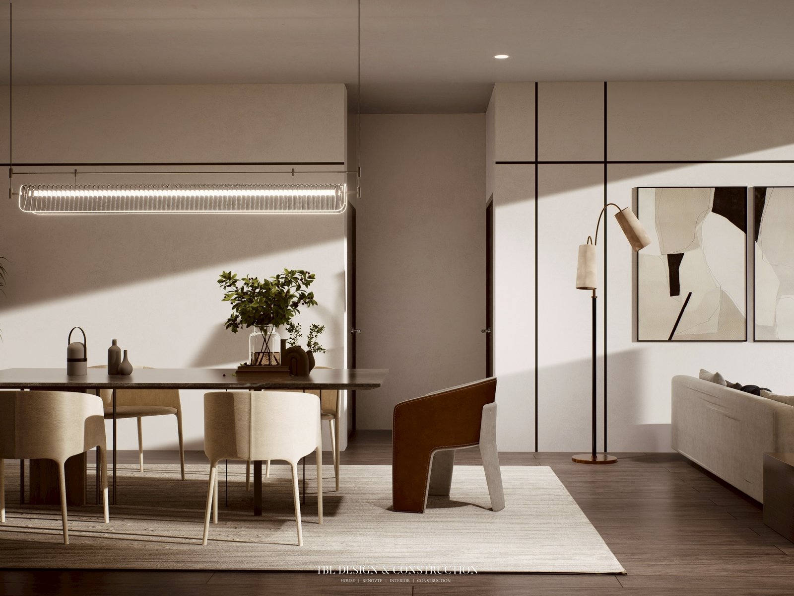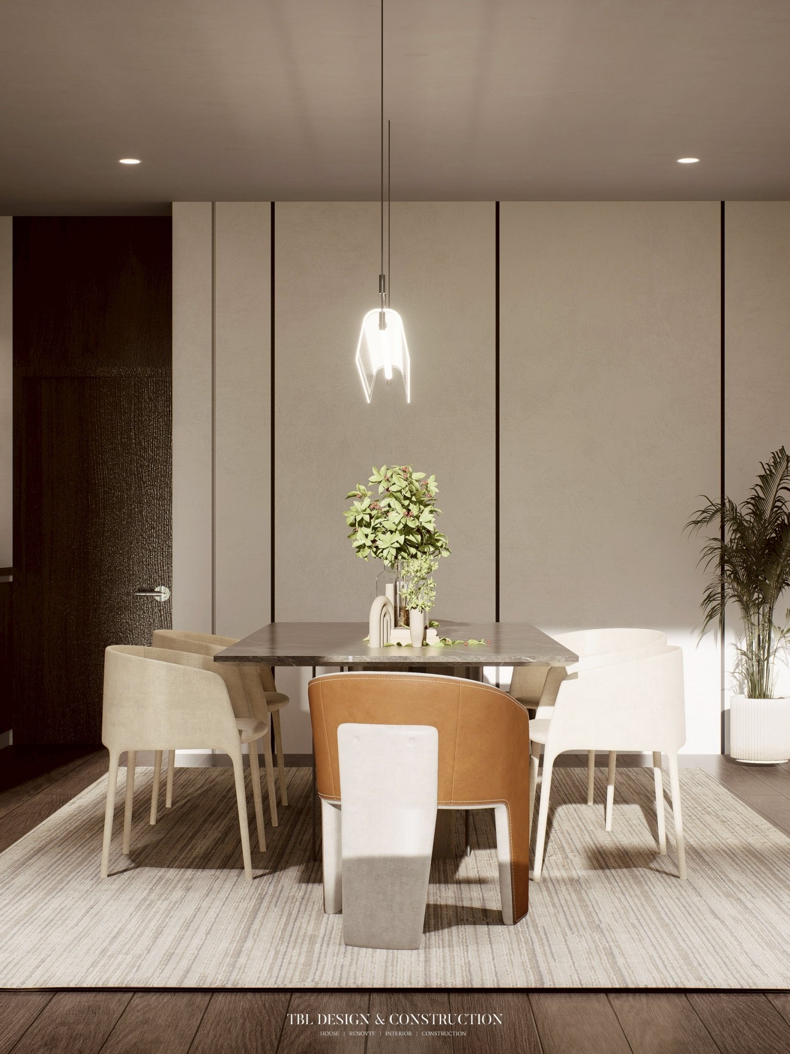• เก้าอี้ดีไซน์พิเศษ: ใช้เบาะผ้าสีครีมคู่กับหนังสีน้ำตาล Cognac เป็นการจับคู่วัสดุที่ให้ทั้งความหรูและสัมผัสอบอุ่น